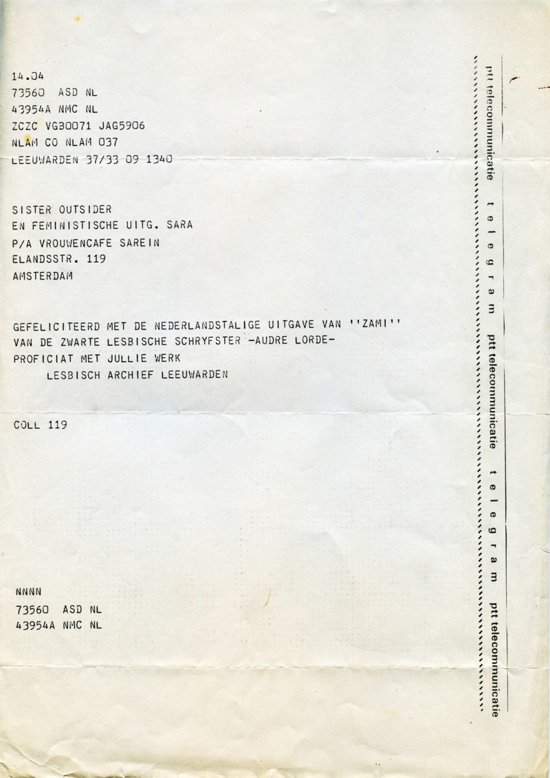 - Telegram Gefeliciteerd [Congratulations] from the Lesbisch Archief Leeuwarden to the collective Sister Outsider and Feministische Uitgeverij Sara, on the occasion of the publication of “Zami” by Audre Lorde in Dutch, 1985.