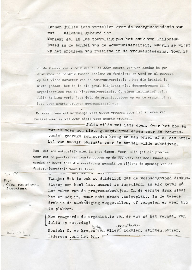 - Typewritten manuscript (excerpt) for the interview Alleen in de derde wereld wonen zwarte vrouwen. Het witte karakter van de WUV [Black Women Only Live in the Third World: The White Character of the WUV] with Mo (formerly Moniek) Salomon and Tineke E. Jansen, edited by Mavis Carrilho and Judith Vega, Amsterdam, 1984.