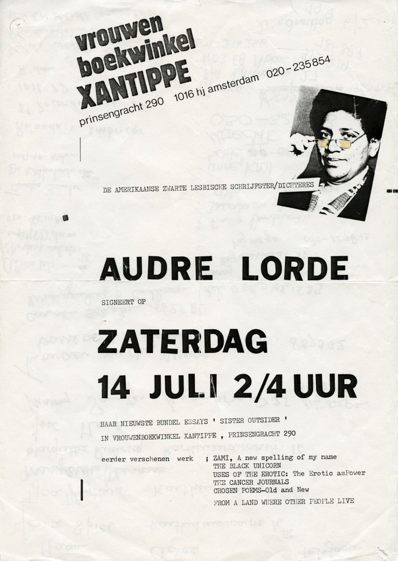 - Flyer Vrouwenboekwinkel Xantippe: Audre Lorde signeert [Xantippe Women’s Bookstore: Audre Lorde Book Signing], 1986.
