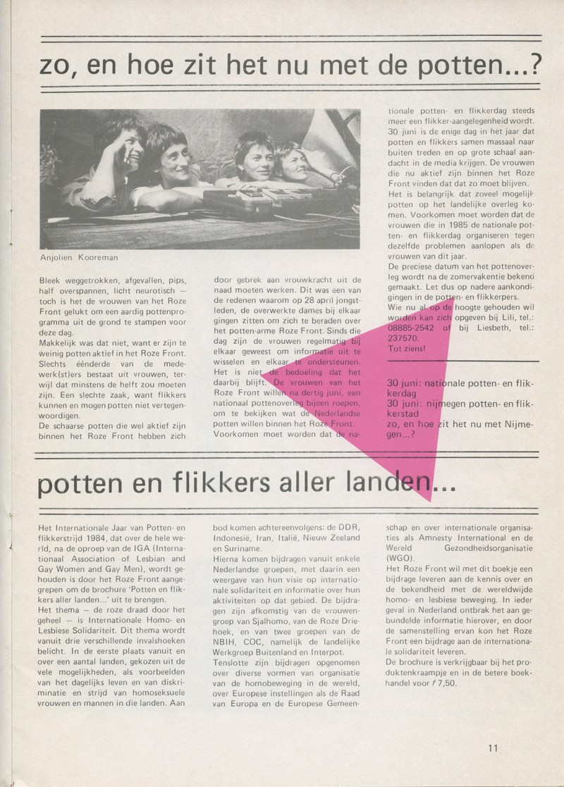 - Magazine articles “Zo, en hoe zit het nu met Nijmegen?" [So, what about the dykes…?] and “Potten en flikkers aller landen…” [Dykes and Fags of All Countries…] in Informatiebulletin ter gelegenheid van de internationale potten- en flikkerdag, edited by Liesbeth Jansen, Pieter Lamberts, published by Het Roze Front, Nijmegen, 1984.