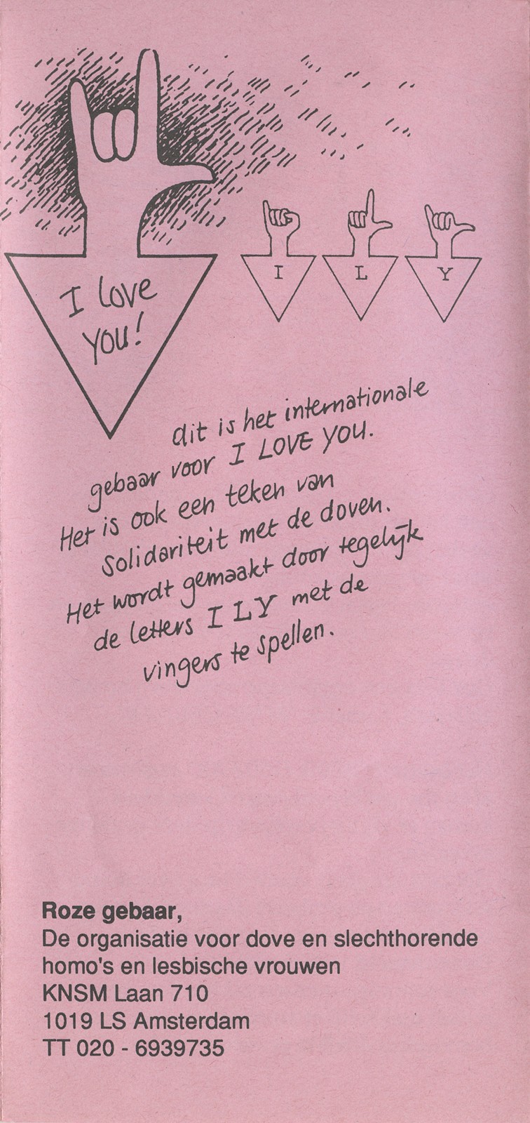 - Information flyer Zit Roze Gebaar nog in de kast!?! [Is Pink Sign Language still Closeted?] by Roze Gebaar, distributed during the Symposium January 26, 1996 at the COC Amsterdam.