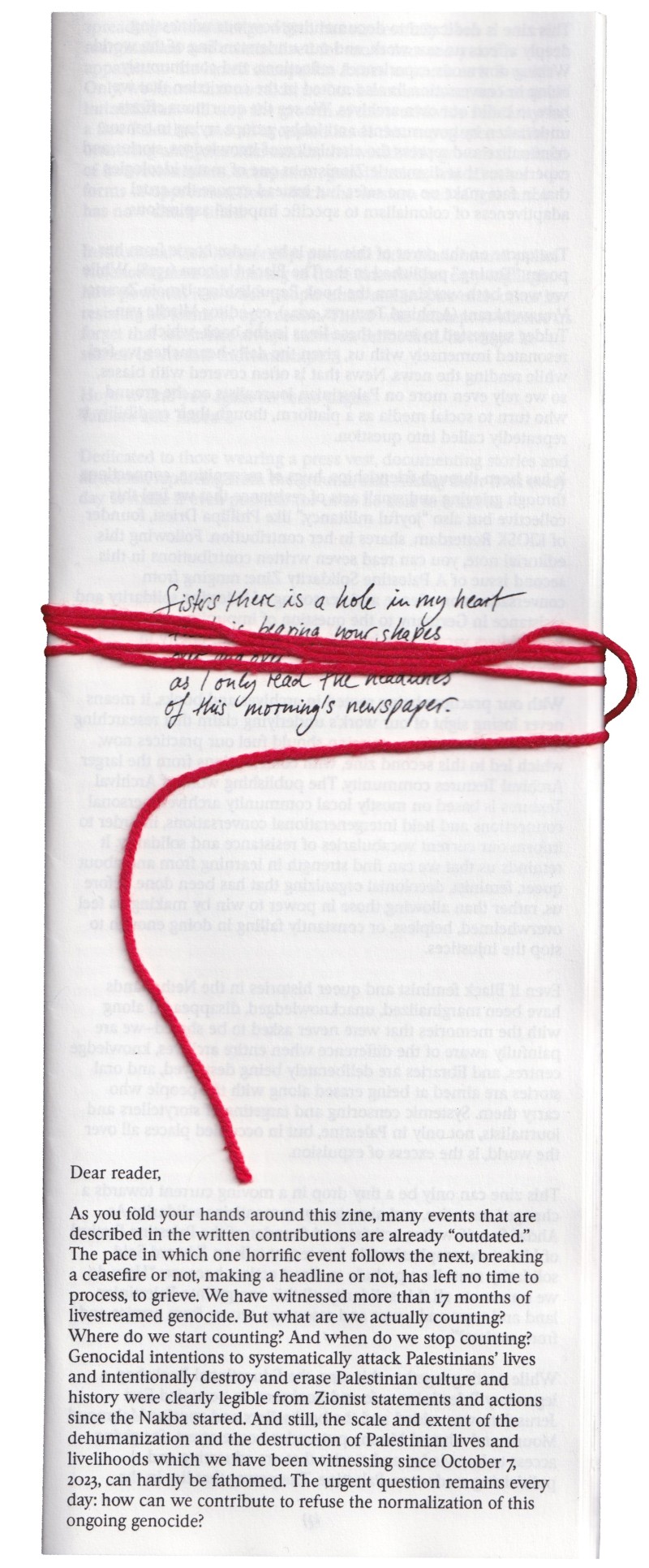 The making of this zine is also inspired by the conviction that we have to build our own archives, as we see the enormous efforts undertaken by governments and lobby groups trying to censor, criminalize and repress the circulation of knowledges, stories and experiences that dismantle zionism as one of many ideologies that in fact make no one safer, but instead expose the cruel adaptiveness of colonialism to specific imperial aspirations.
